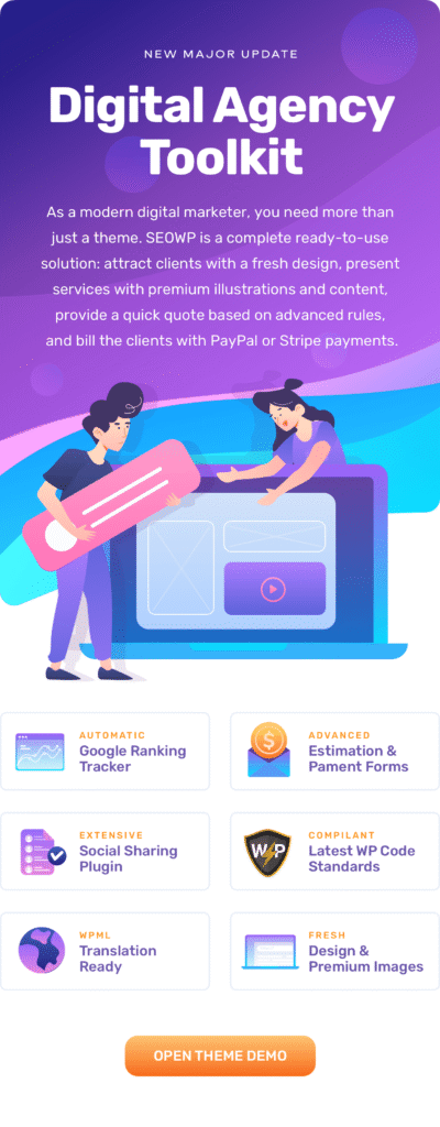 If you run an agency that helps people with Google search rankings, or maybe you are a social media expert, you need a website that looks professional and, most important, is set up for good SEO right from the start. That’s why we’re talking about the seowp wordpress theme today.